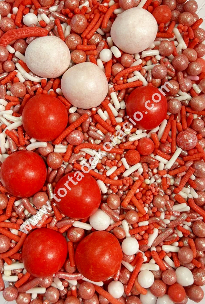 Piros színű, ehető cukordísz több féle formában és színben vegyesen.