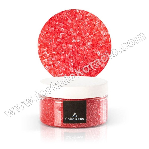 Szórócukor kristály piros. Remek dekorációs ötlet pl. csokoládéra, fánkokra, tortákra, muffinokra - bármilyen desszert jól dekorálható vele.