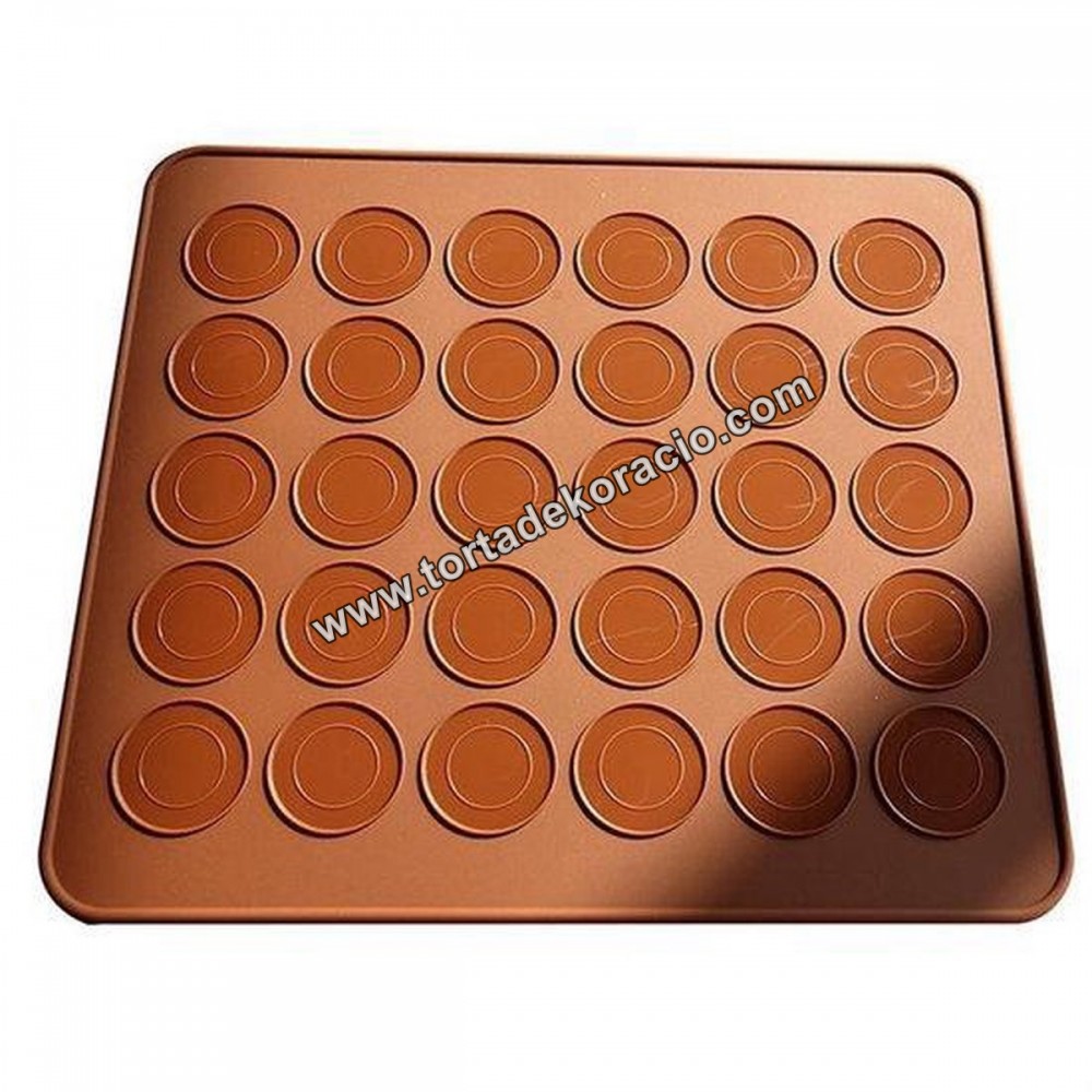 Anyaga: szilikon Tartalma: 1 db szilikon sütőforma 30 sütikorong készítéséhez. Átmérője cca. 3,8 cm Színe: barna Tisztítása: semleges folyékony mosogatószerrel. Kerülje a karcosodást okozó szerek és eszközök használatát. Használata: A krémet töltse a tésztaadagolóba, majd nyomjon kis korongokat a sütőforma mélyedéseibe. Hagyja állni 1 órát szobahőmérsékleten. Majd tegye a sütőformát előmelegített sütőbe. Ha megfelelő állagú masszát kevert, akkor a tetejük nem fog szétrepedni. Sütés után hagyja kihűlni, majd töltse meg, és illessze össze a két fél korongot. Ajánljuk: az ünnepi sütés-főzéshez, húsvétra, karácsonyra, partikra, egyéb alkalmakra is A tésztát színezheti is. Használhat mesterséges ételfestéket, vagy természetes színezőket (például: céklalé, sáfrány, kakaópor). A töltelékek alapanyagainak és ízeinek csak a fantázia szab határt. A macaronokat megtöltheti csokoládé, karamell, vagy gyümölcsízesítésű krémmel, lekvárral vagy gyümölcszselével.